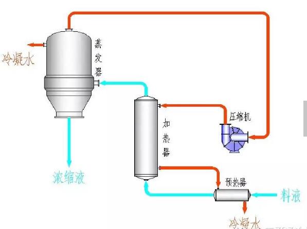 MVR蒸發(fā)器采用壓縮機(jī)提高二次蒸汽的能量,并對(duì)提高能量的二次蒸汽加以利用,回收二次蒸汽的潛熱。具體為:將蒸發(fā)器產(chǎn)生的二次蒸汽,通過(guò)壓縮機(jī)的絕熱壓縮,使其壓力、溫度提高后,再作為加熱蒸汽送入蒸發(fā)器的加熱室,冷凝放熱,因此蒸汽的潛熱得到了回收利用。冷料在進(jìn)入蒸發(fā)器前,通過(guò)熱交換器吸收了冷凝水的熱量,使之溫度升高,同時(shí)也冷卻了冷凝液和完成液,進(jìn)一步提高熱的利用率。